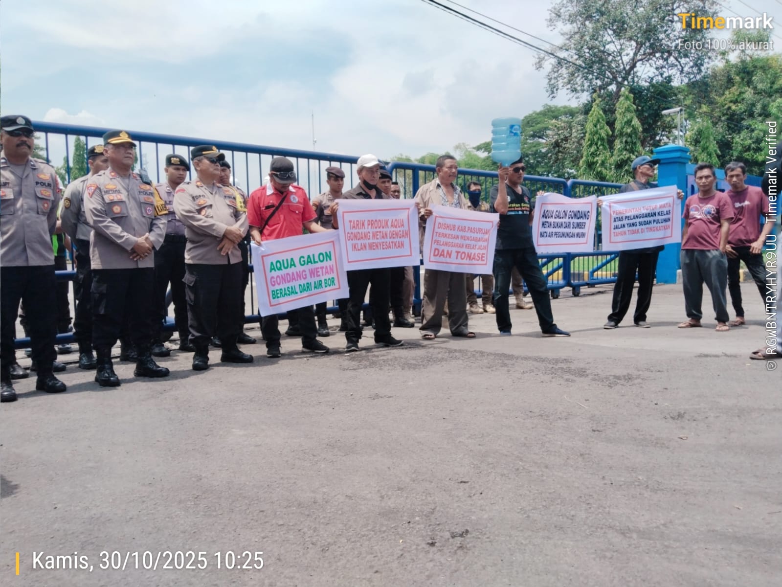 Pasuruan, JATIM | SidikFakta.com – Aliansi Lembaga Perlindungan Konsumen (LPK) se-Pasuruan Raya yang menggelar aksi unjuk rasa di depan pagar pabrik Aqua menuntut keterbukaan izin usaha PT Tirta Investama. Produsen air minum dalam kemasan (AMDK) bermerek Aqua, yang beroperasi di Desa Tenggilis, Kecamatan Gondang Wetan, Kabupaten Pasuruan, Kamis (30/10/2025).